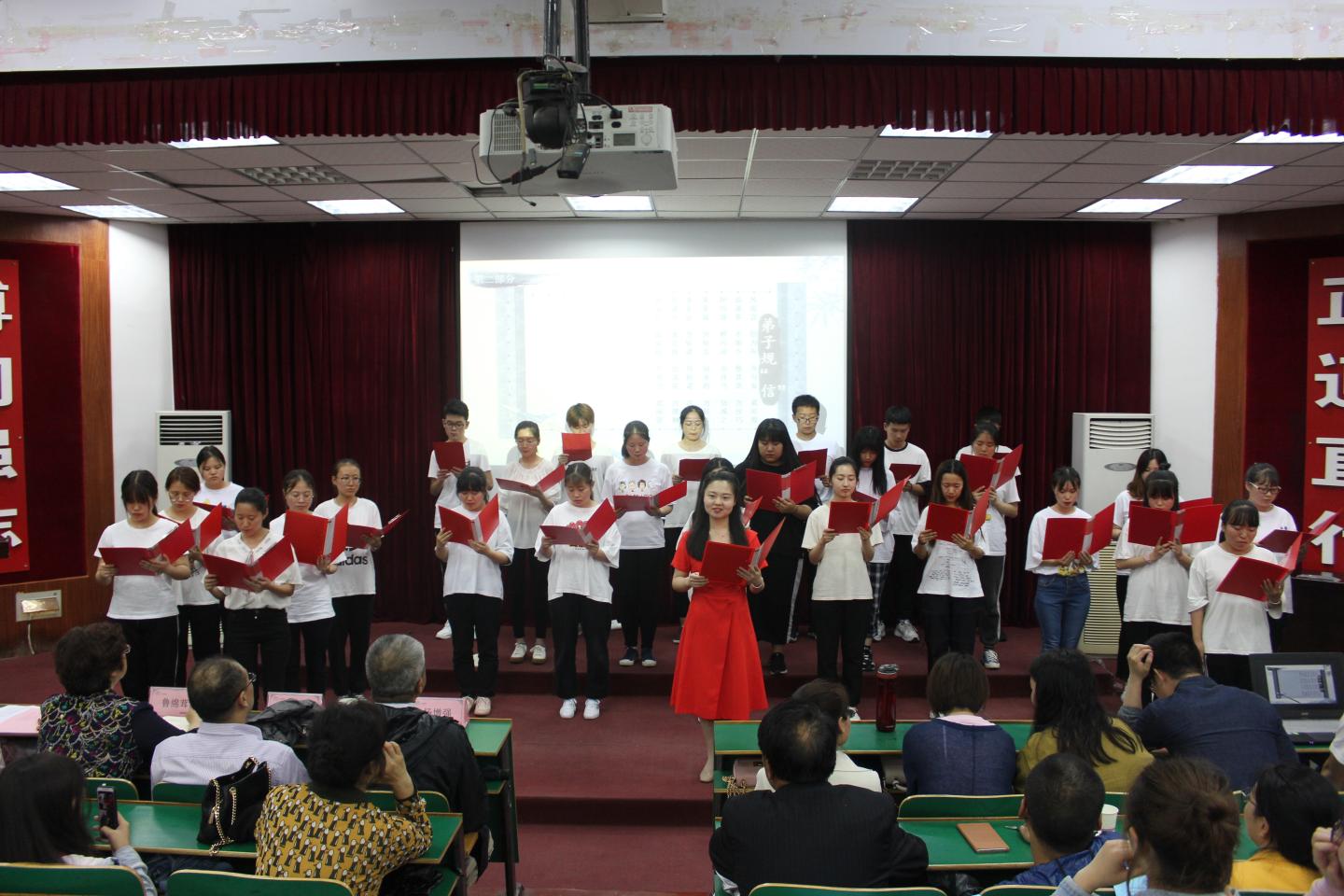 本期“道德讲堂”由唱道德歌曲、诵道德经典、学道德模范、听道德报告四个环节组成。活动在悠远清婉的《公民道德歌》歌声中拉开帷幕。随后,在李梦姣老师的带领下,社会1801班全体员工激情诵读了《弟子规》中的《信》片段,让现场的观众感受到了道德经典的魅力,赢得了阵阵掌声。接着,全体人员共同观看了陕西省第五届道德模范、孝老爱亲类“中国好人”唐伟丽的感人事迹短片。
