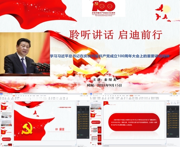 2021年恰逢建党一百周年,为弘扬伟大建党精神,巩固党史理论学习,9月15日,公司员工第一党支部举办了学习习近平总书记“七一”重要讲话精神专题党课。考虑到我支部大部分护理专业党员在外实习的特殊性,本次主题党课以线上讲授为主,党支部书记秦绍龙为支部全体党员做党课报告。