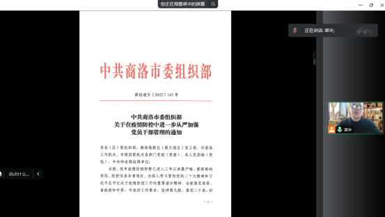 会议首先由支部书记梁丰领学了《中共商洛市委组织部关于在疫情防控中进一步从严加强党员干部管理的通知》,号召并要求全体教工党员讲政治、讲大局、讲担当,在做好疫情防控各项工作中践行初心使命、体现责任担当,充分发挥党员的模范带头作用。