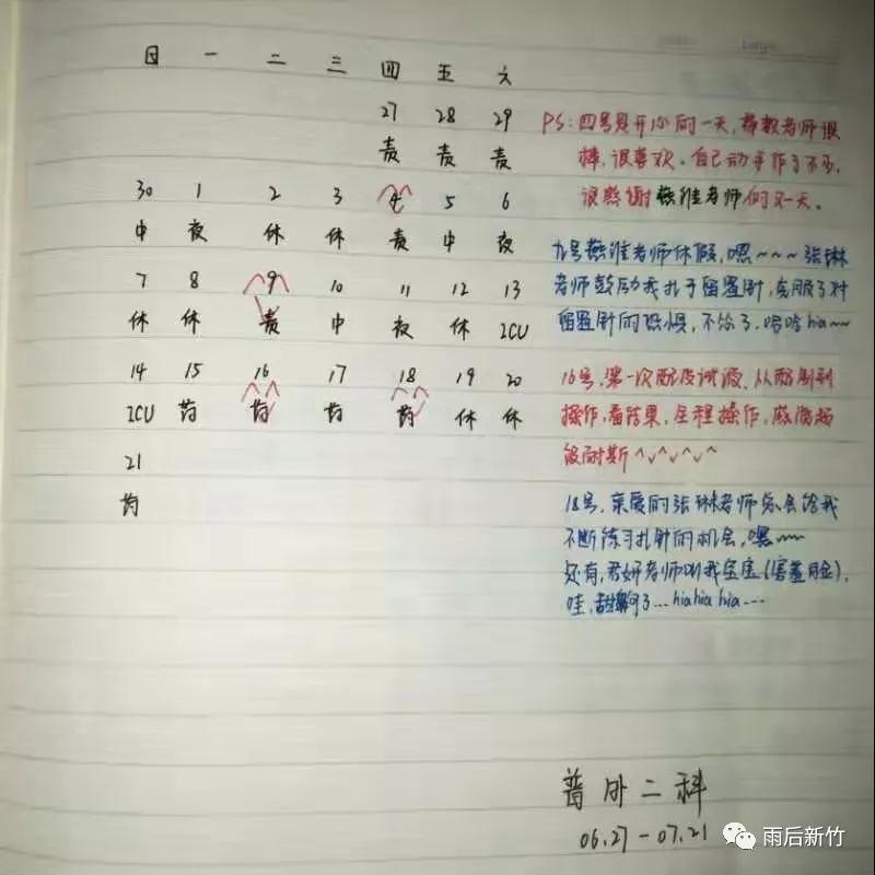 6月27号,报道的时候已经中午十二点了。老师们都在吃饭,就在找不到地方找不到门路一头懵的转圈儿的时候,余磊老师从休息室出来问道:“丫头,是来报道的实习生吗?吃饭点儿了,赶紧把东西放下去吃饭吧,下午再来报道,不急!”听了之后就觉得,哇,老师真的超级温柔呀!接着,我在普外二科25天的实习生活就这样上映了!