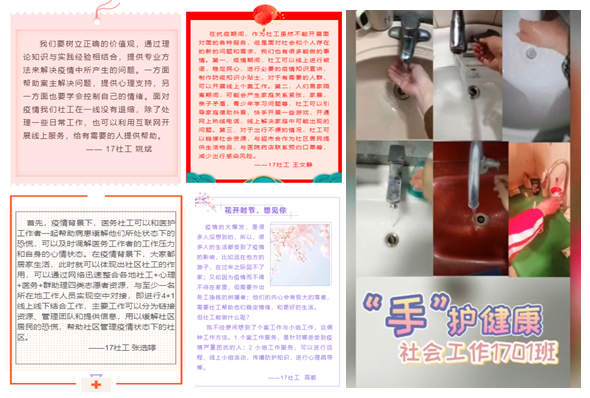 超人也会有铠甲,防范意识不掉下。从“防护知识合集”到“宅家防护攻略”,从“疫情思考”再到“社工学子版洗手舞”,这其中囊括着社工学子的“助人自助”和社会工作专业的“用生命影响生命”。
