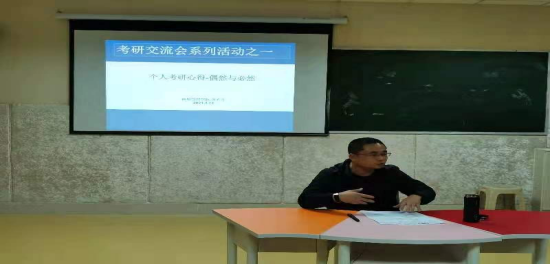 本次交流会首先由主讲人黄光圣老师分享了自己的考研心得。重点讲解了择校、备考过程中的细节及注意事项等问题。黄老师强调考研是改变命运的开始,他还对同学们阐明了考研成功的偶然和必然性,以及在备考中对往届考研资料学习和合理安排时间的重要性。