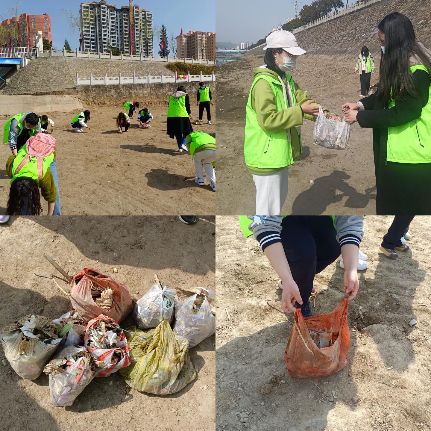 在本次活动中,同学们不怕脏不怕累,对河滩及河水周围的垃圾进行捡拾,并将捡拾的垃圾有序分类。大家秩序井然,不放过一个垃圾。在清理结束后,大家将垃圾带走并扔进垃圾桶里。