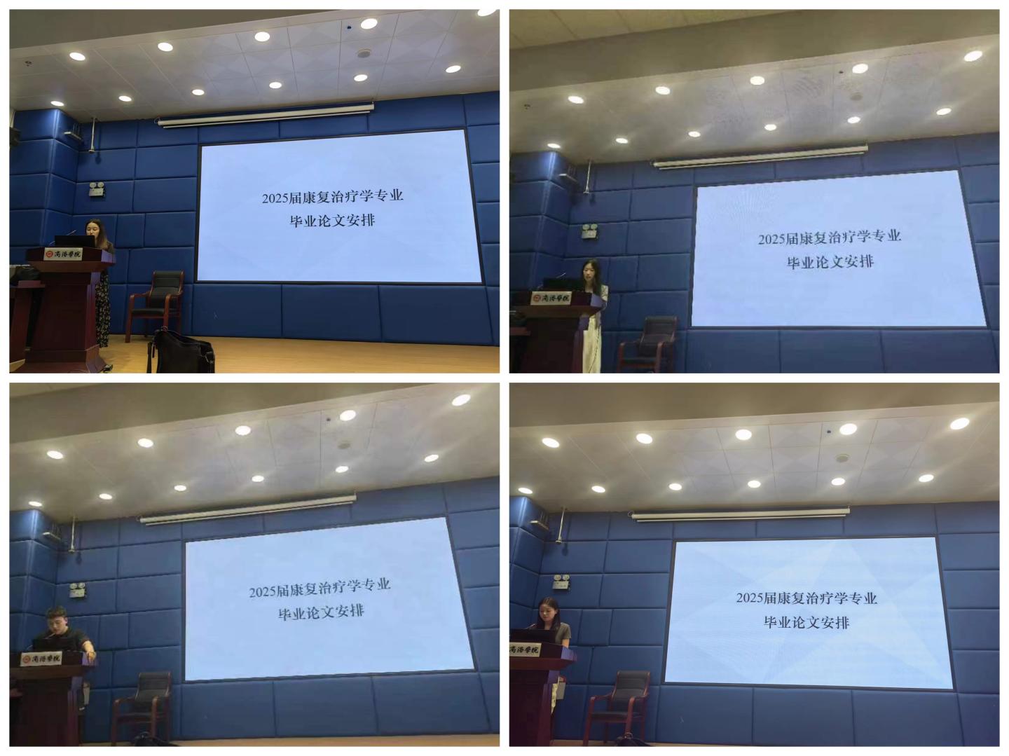 康复系主任李娟芳对2025届各实习医院实习时间、带队教师及实习组长名单进行了安排,并强调了实习期间的各项规章制度及要求。指导教师王琳向2025届员工解读毕业论文选题方向、研究方案设计等方面注意事项,并着重强调了论文撰写各个时间节点任务。员工代表蒋昕睿、陈可意、张钰轩分享实习经历及收获;宋欣阳分享硕士研究生成功上岸经验。