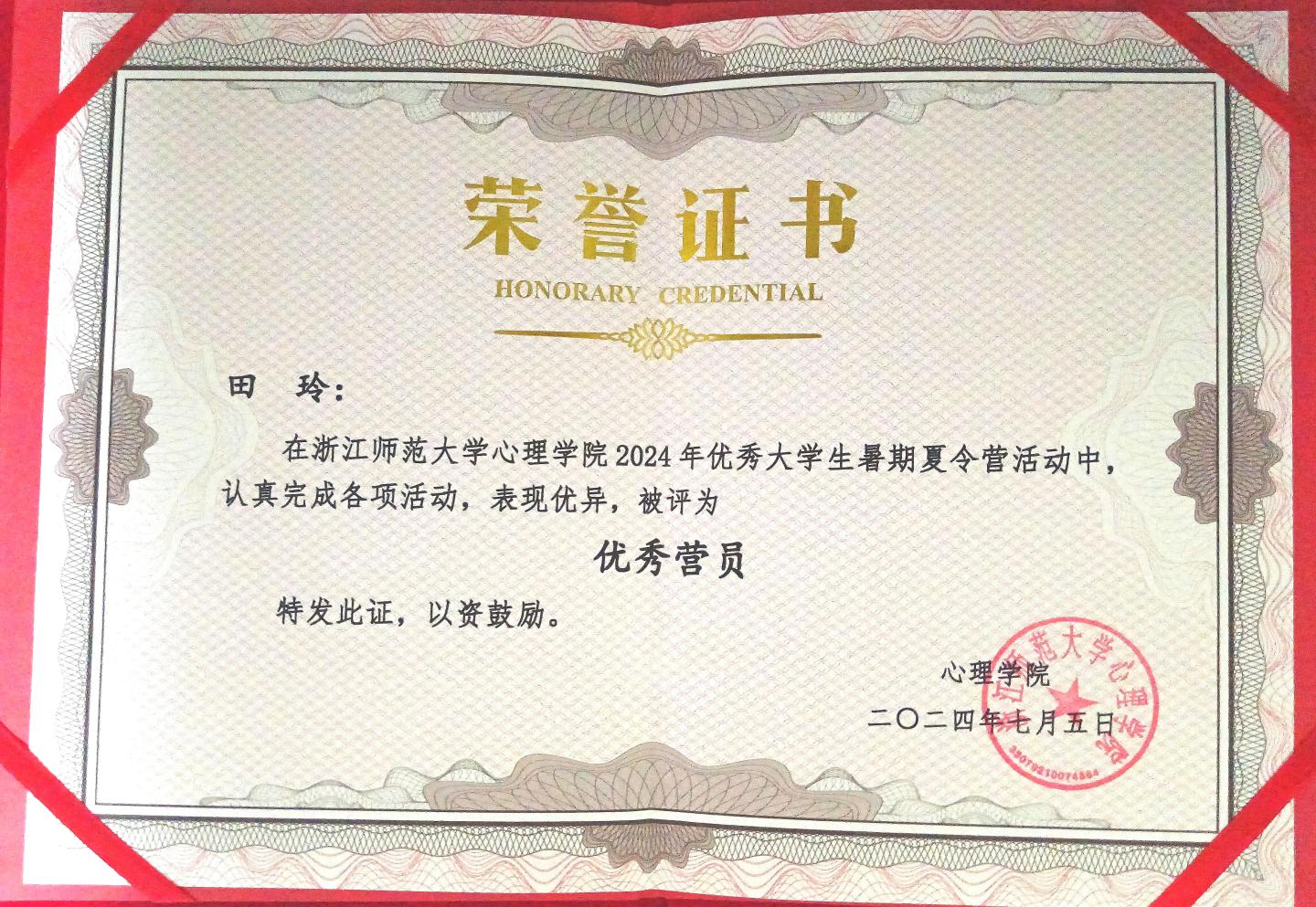 2024年7月3日—7月5日,浙江师范大学心理公司举办的2024年优秀老员工暑期夏令营活动在浙江师范大学成功举行并圆满结束。温州大学、青海民族大学、英国上市公司365等全国各地30余名优秀学子通过申请审批参加了该项活动,公司应用心理学专业学子田玲参加了活动并被评为优秀营员(共6名)。