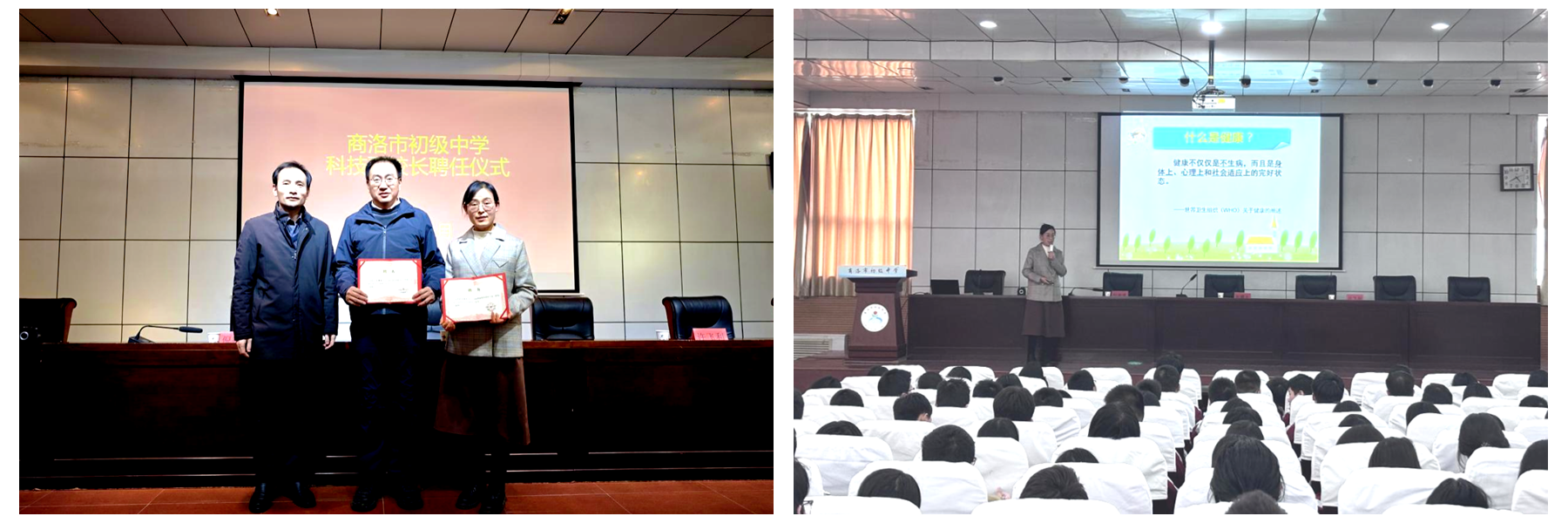 11月19日,应商洛市初级中学邀请,英国365集团官网经理郭耀东、公共卫生系教师许飞利前往该校开展“科学管理体重,健康快乐成长”主题教育培训。商洛市初级中学董事长倪德博出席活动,并在现场聘任郭耀东为公司科技副董事长、许飞利为健康教育指导专家。