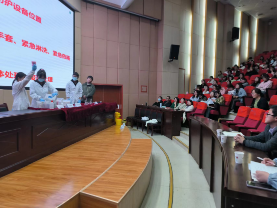 公司实验室兼职管理员刘金虎老师从实验室简介、实验室安全教育、实验安全应急处理三方面进行了报告,他介绍了实验室用水、用电、用气、用火、试剂安全、废液处理、人身防护等实验室安全知识,强调了实验室安全的重要性,提醒师生重视实验室安全防范。食品卫生与营养学2301班的王紫雯、何小柳、唐袆翡、韩卓睿4名同学表演了“盐酸泄露应急处理”和“医疗垃圾处理”实验室安全操作情景剧,他们通过错误操作与规范演示的对比,向师生们展示了实验室安全操作中的注意事项,加深了大家对实验安全的认知。报告结束后,张晓文对本次报告进行了总结,她强调每个人都是实验室安全的责任人和主体人,每一位师生都要重视实验室安全防范。