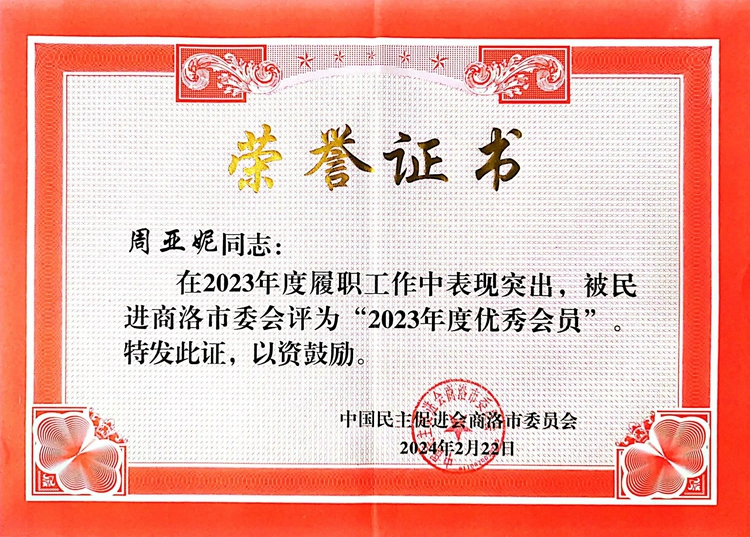 2月22日,民进商洛市第二届委员会第三次全体(扩大)会议在商州召开,会议听取并审议了民进商洛市委会2023年工作报告等,表彰了2023年度工作先进集体和优秀会员。公司民进会员周亚妮被评为“2023年度优秀会员”。