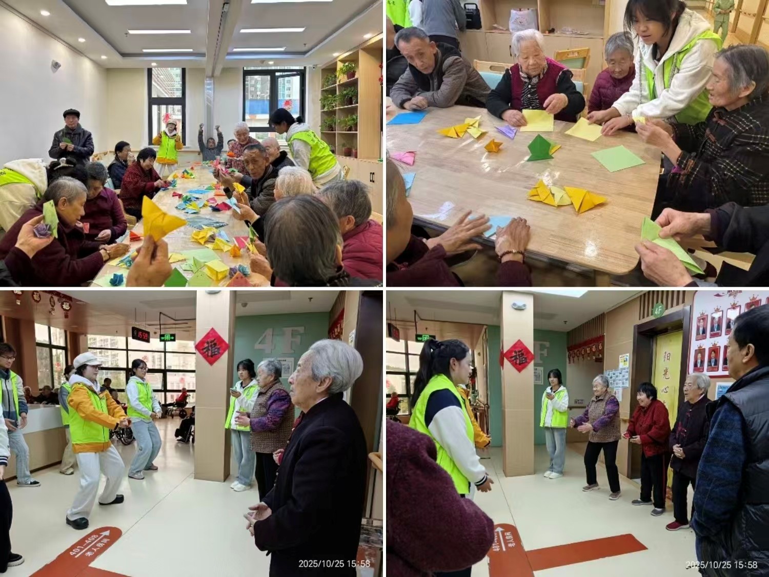 服务活动中,在折纸区,志愿者们“一对一”耐心地为老人们讲解折纸步骤,遇到手指灵活度稍弱的老人,志愿者便手把手协助操作,放慢语速、重复示范,直到老人掌握技巧。在八段锦练习区,志愿者们则化身为“小老师”,带领老人们舒展身体。考虑到老人的身体状况,志愿者特意简化了部分动作难度,提醒大家“动作放缓,注意呼吸”,并时刻关注老人们的身体感受。