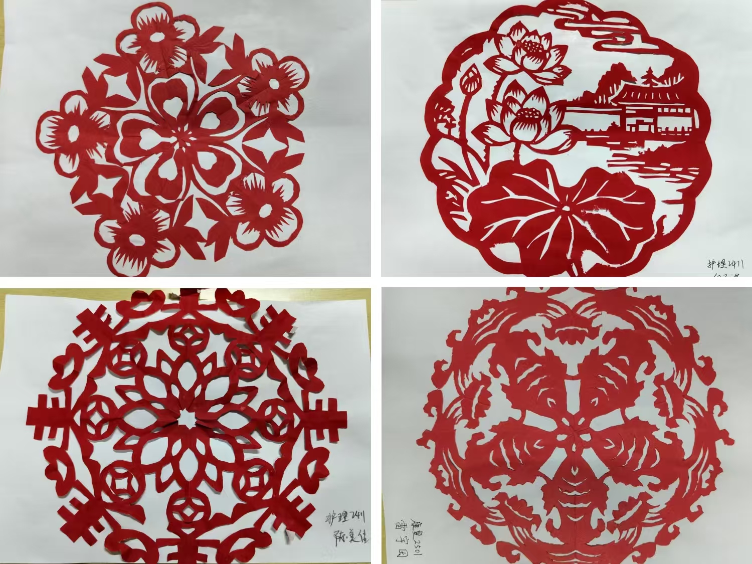 活动中,同学们探讨和交流剪纸的历史渊源、地域特色,深入了解“福”“囍”“鱼”“莲花”等纹样的文化寓意。大家或剪出“连年有余”纹样寄托富足期盼,或创作精巧“福”字窗花赋予传统符号新表达,在“以指尖为笔”的实践中,触摸非遗文化深厚底蕴,深化对传统文化的理解与热爱。